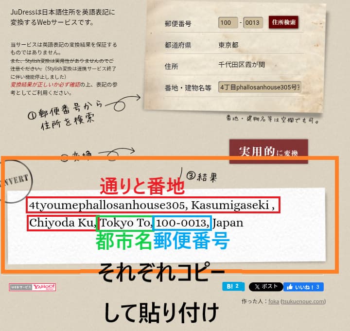 自分の住所を英語にするには、「JuDress」で変換すると便利です。